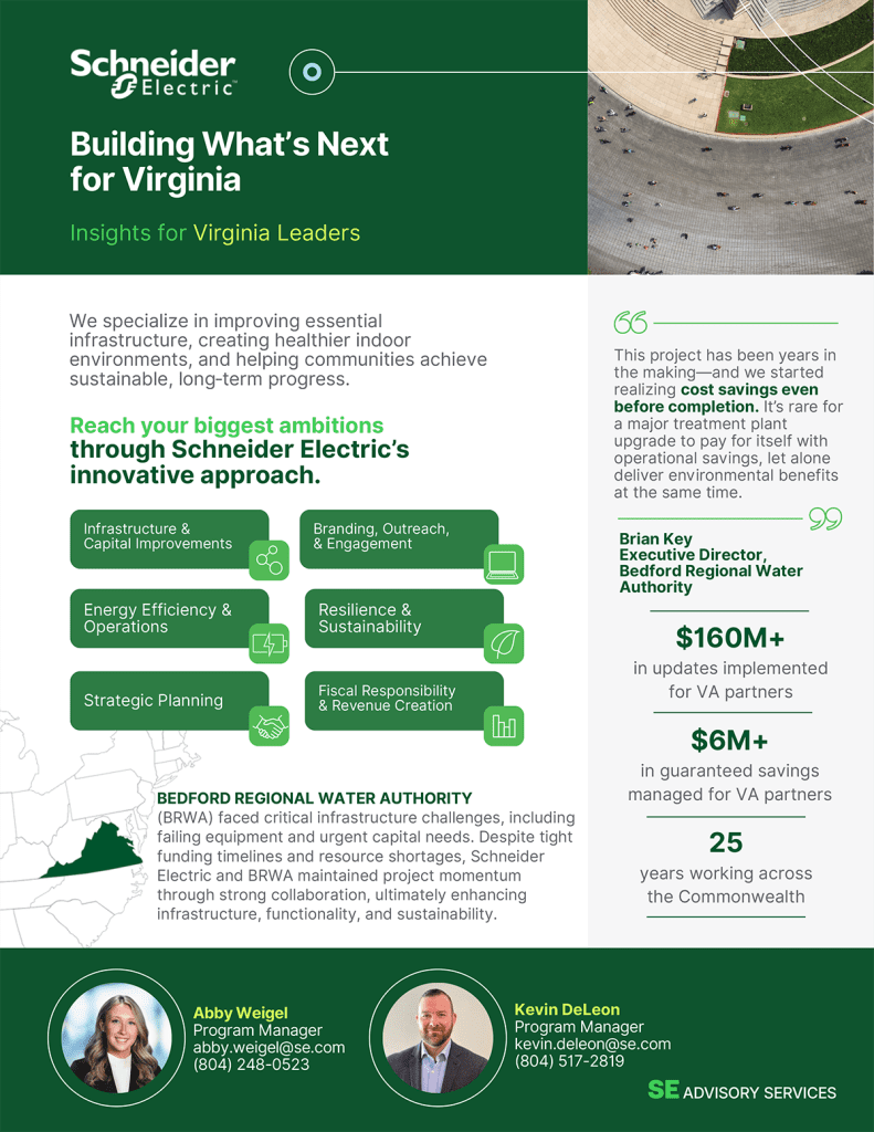 As a Premier Partner of the Virginia Association of Counties (VACo), Schneider Electric has proudly served as a trusted energy and infrastructure partner across the Commonwealth since 2001. We specialize in supporting school districts, municipalities, higher education institutions, and state agencies in overcoming budget constraints through strategic capital funding solutions.