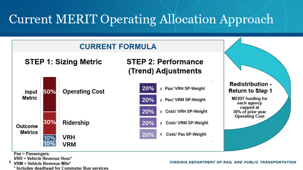DRPT states that the recommended formula prioritizes service (outcome measures) over cost (input measure) by increasing outcome focused weights such as ridership, vehicle revenue miles and hours. As with the current formula, the recommended scenario will not allow any transit agency to receive more than 30% of its operating assistance from the MERIT program.