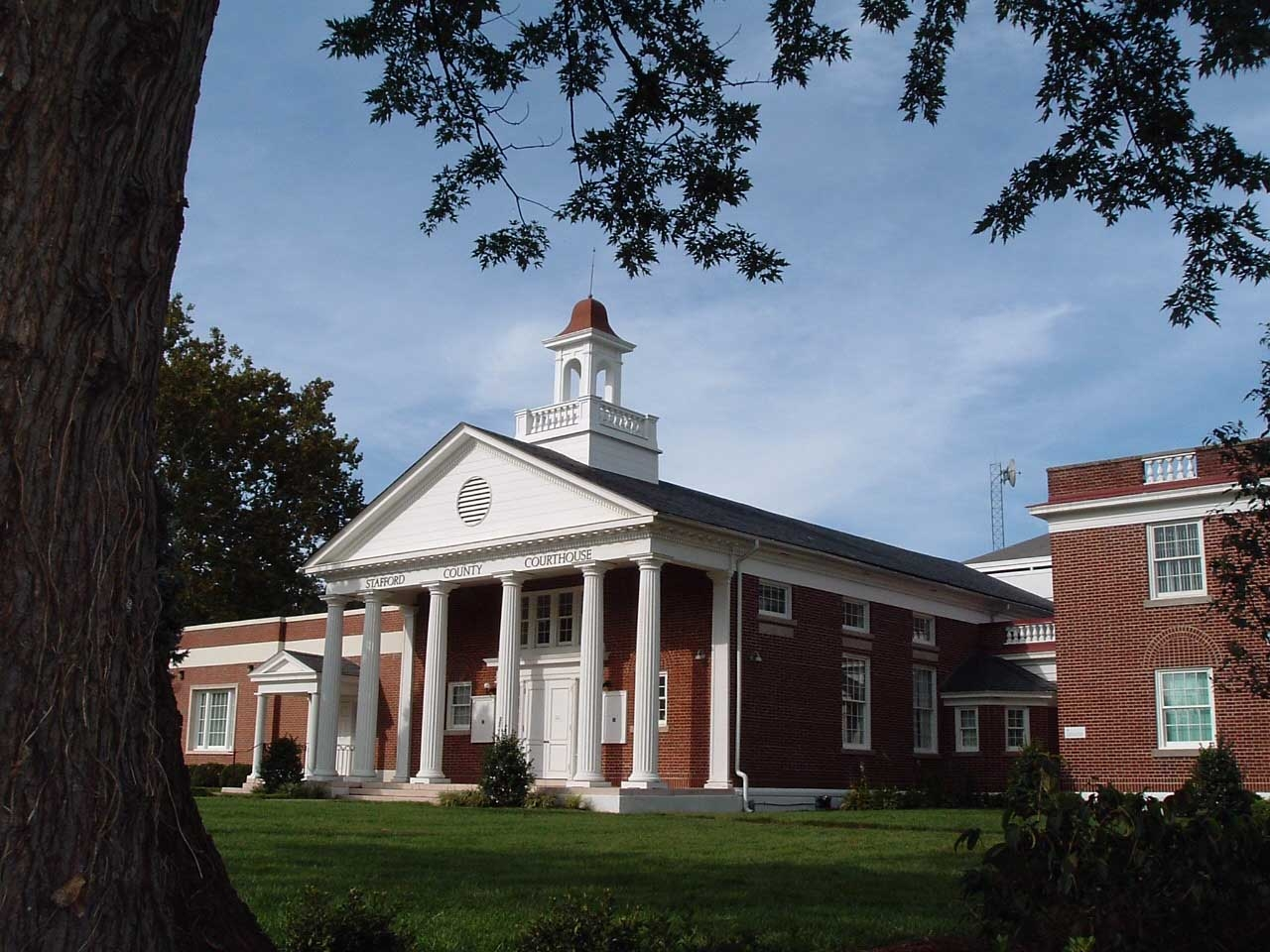 History: The county was created in 1664 and the county was organized in 1666. The court first met in private homes. In 1691, Marlborough was established and the first courthouse was a wood structure built. The courthouse burned in 1715 and was not replaced. The second courthouse was built in 1715 at Stone Landing. In 1783, the county seat was moved to Stafford and the third courthouse, a one story structure was built. The fourth courthouse was a one story “T” shaped structure built in 1840. The fifth and present courthouse was constructed in 1922 to 1923. The County Judicial Center was constructed in 1993.