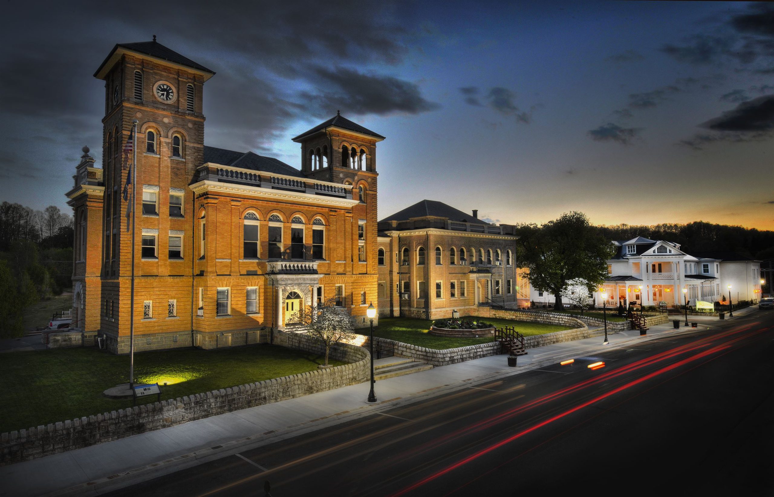 Description: The building faces north east and is a two story buff colored brick structure. The building is located on landscaped grounds in the center of Wise. The north front has a small porch at the central entrance with two columns rising to a balcony on the second story. The northeast corner has a high square clock tower and the northwest corner has a high square tower with openings at the top. The second story windows are arched. The base of the building is rough cut limestone. In the interior, the central entrance hall has an open well stair executed in cast iron with classicized newel in the form of a fluted column with an Ionic capital, an iron railing with fanciful scrolled decoration and applied anthemion ornamentation, and open-work treads also executed in cast iron. A wooden matchboard wainscot runs the perimeter of the hall. The hall retains its original pressed-tin ceiling. The second story has the courtrooms. The building houses the County Circuit Court, County General District Court and County Juvenile and Domestic Relations Court of the 30th Judicial Circuit. The architect was Frank Pierce Milburn and the contractor was Milbourne Gilliam & Creed Flanary. On the west side is a light brown colored brick two story addition constructed in 1920. The addition has a balustrade along the flat roof line. On the south side is the modern courthouse constructed from 1979 to 1980. The architect was Charles B McElroy and the contractor was Armstrong Construction Company, Inc.