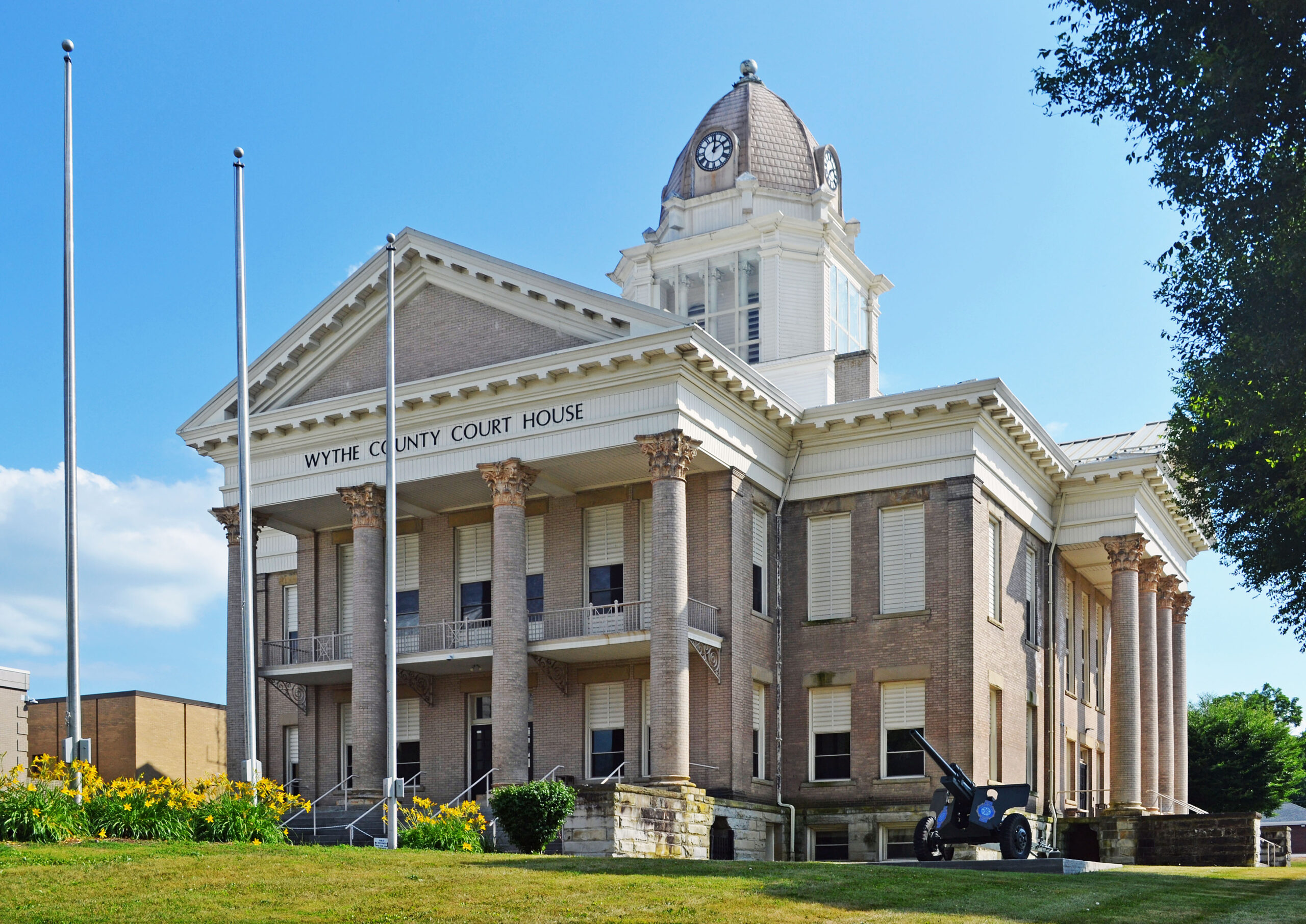Description: The building faces northeast and is a two story buff colored brick and concrete structure. The building sits on a low hill which descends on the north side in the center of Wytheville. The northeast front has a projecting center section with a large portico with four Corinthian columns rising to a wide pediment at the roof line. There is a wide balcony on the second story. On the center of the roof is a large eight-sided dome with clock and gold colored roof at the top. The interior features a center lobby with patterned ceilings, heavy scroll brackets at the intersection of passageways, and staircases with turned balusters and decorative square newels. The building is used for county offices.